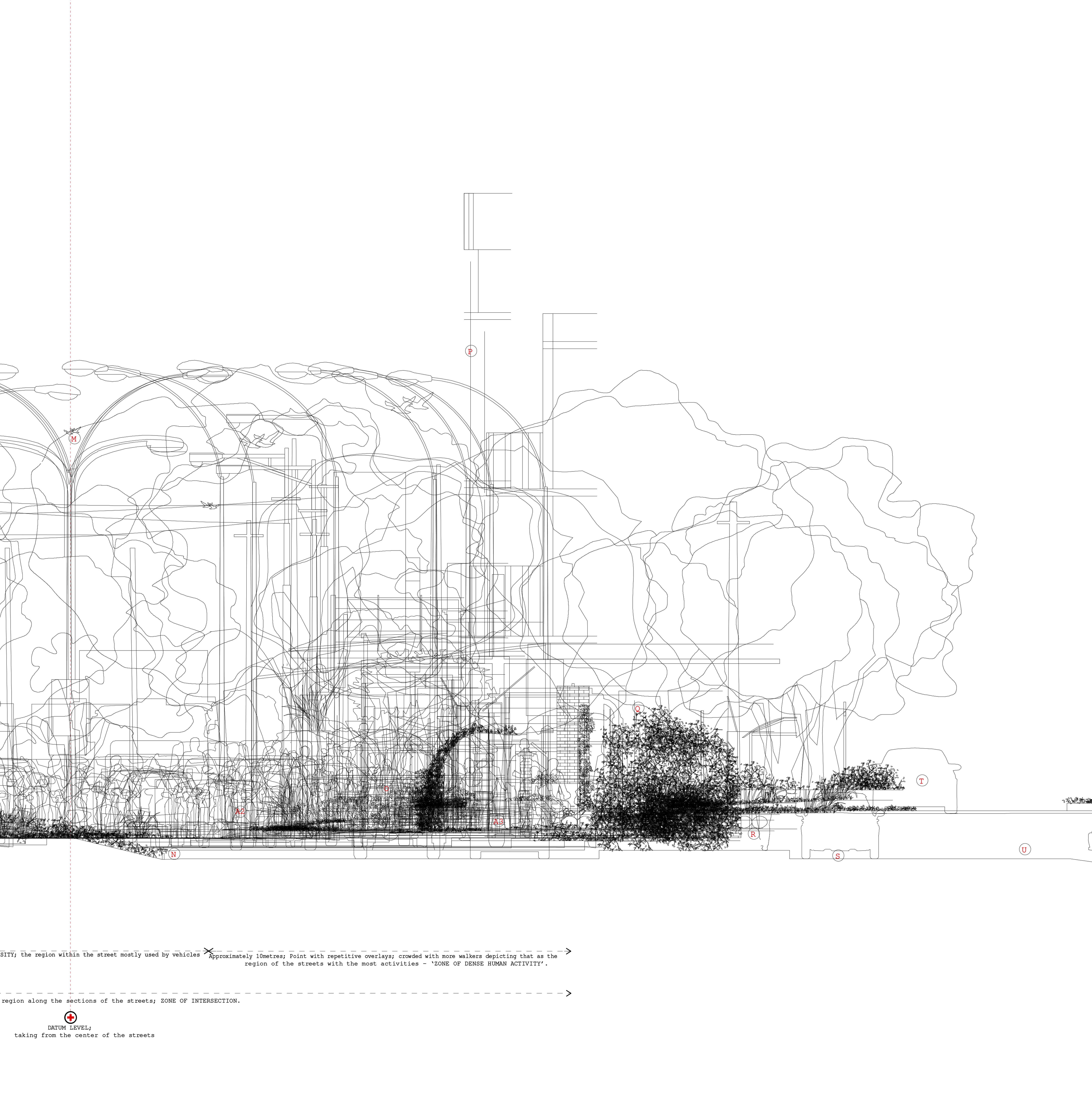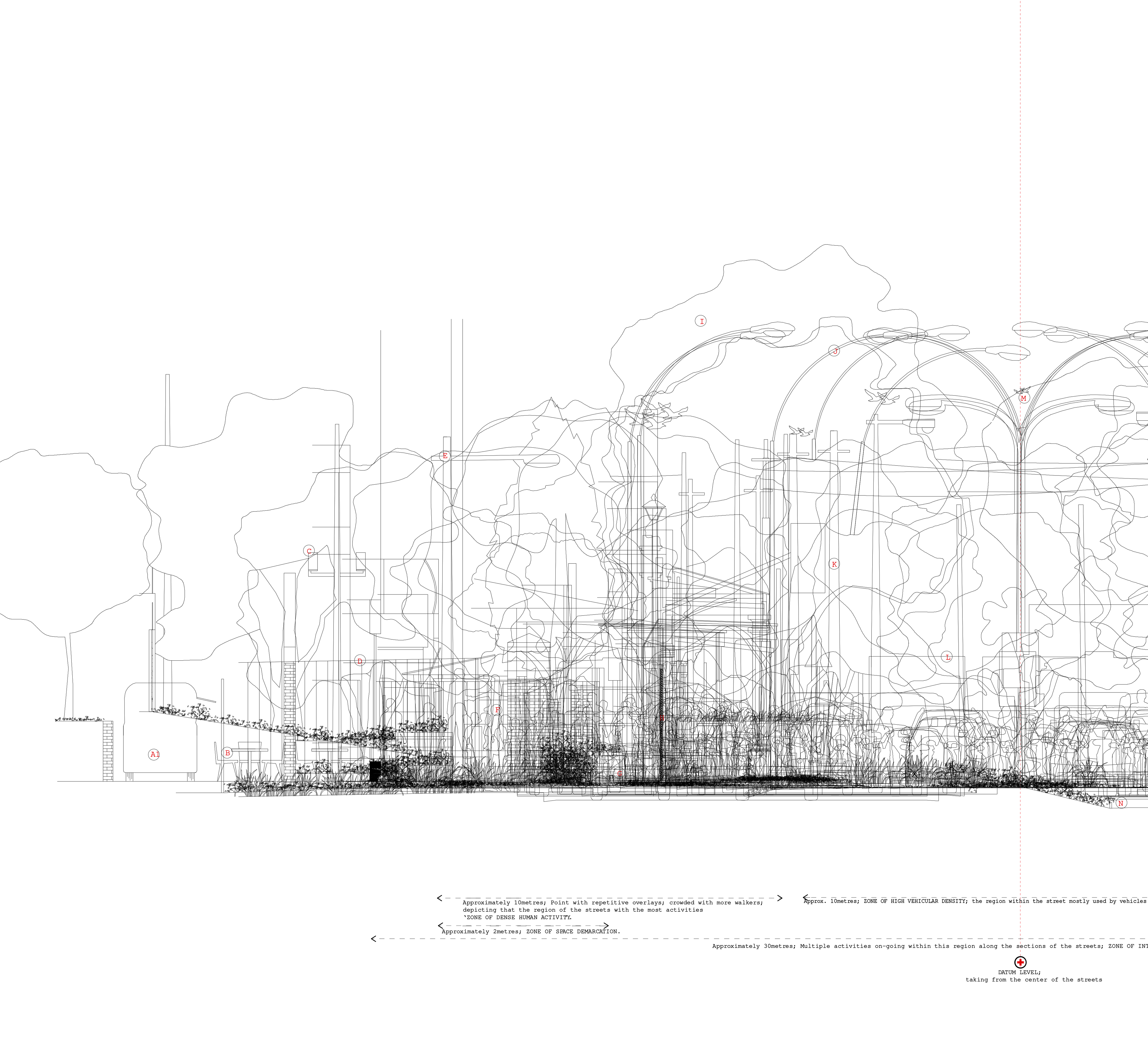 Drawing in Section was a significant methodology inspired by Robert Mantho [7]. Superimposing about 40 street sections, I began to tease out tactile indicators of danger or safety in streets such as sidewalks, lights, materiality, technical compositions (height, width, and length), furniture (outdoor seats, bollards), colour and activities present there. This process of mapping and drawing clearly accentuated the similarities and homogeneities despite the locational differences in the urban context.