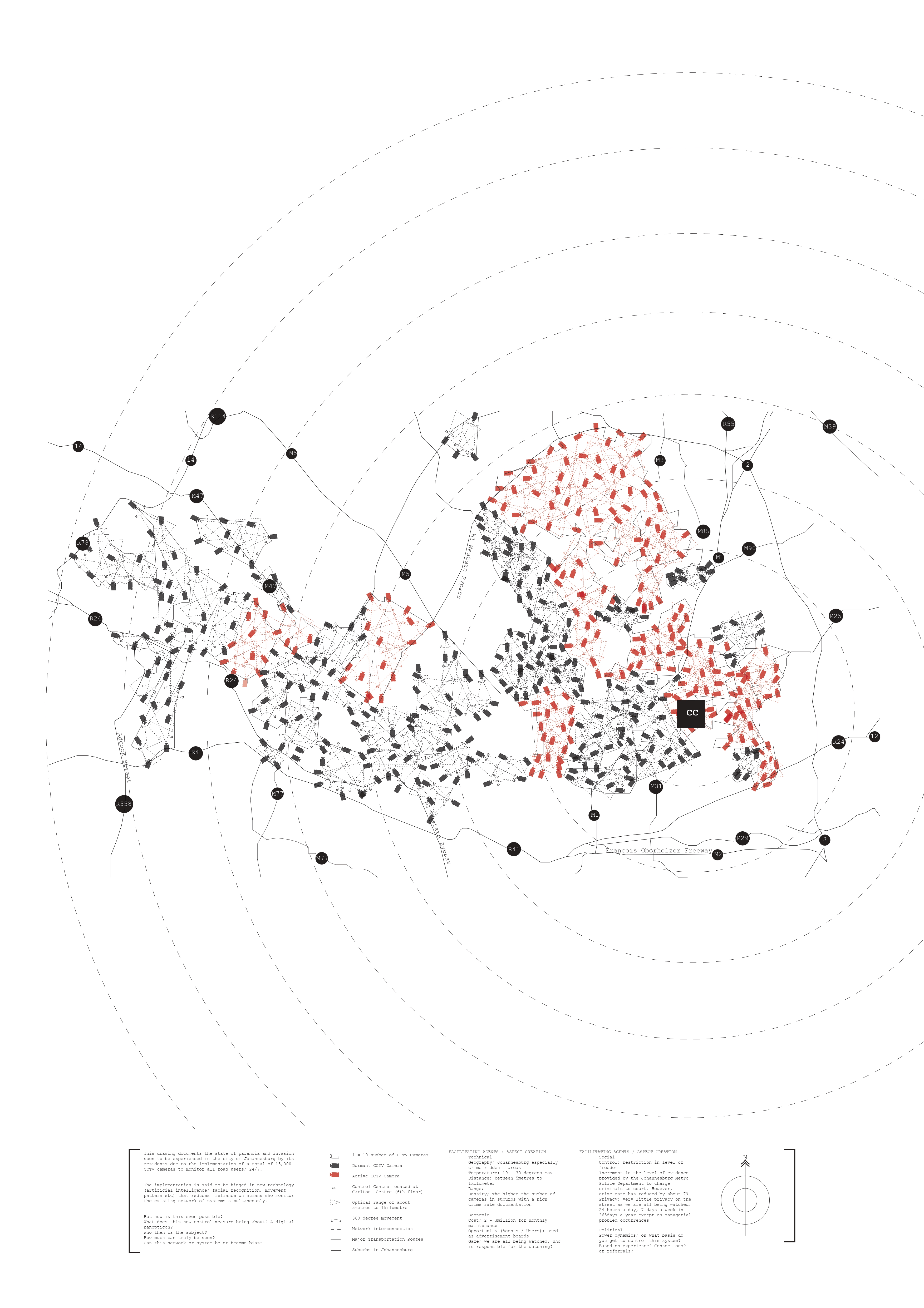 Honing in on the CCTV-scape in Johannesburg [the red indicates the functioning and active CCTV cameras, and the black speaks to the dormant cameras; meaning the functionality of the cameras were unstable], it became clear that many of the installed cameras were not properly maintained and experienced some downtime in monitoring. I would argue this was largely due to the privatization of the system; where the installation was managed by private companies such as VumaCam assigned by the government, maintenance was carried out by the Metropolitan Trading Company (MTC) and supply was done by Hik-vision; a China-based company. This level of privatization and global input is somewhat permitted as a result of the association of the five major emerging national economies: Brazil, Russia, India, China and South Africa known as BRICS [8], suggesting that such lateral associations have real-world consequences. The conveyed “agenda” to monitor the general society and instil discipline and in-turn reduce rocketing crime rates becomes a breeding ground for super-complex dynamics.
