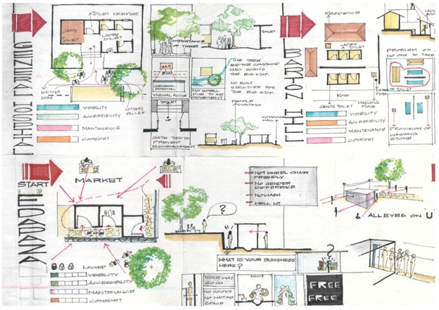 Sketches on the toilet spatial study & execution. Credits: Meenakshi Meera