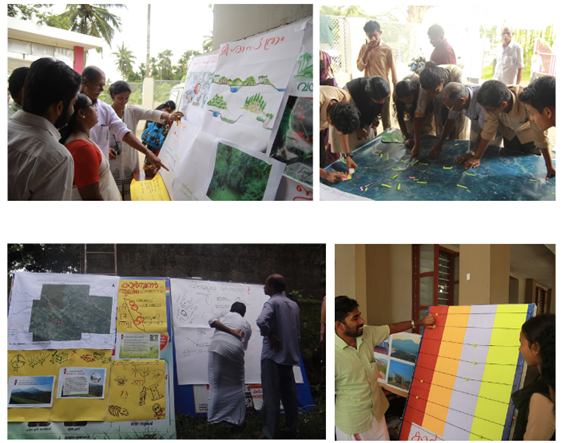 Photos showing community participation event at Meenagadi, 2017; Images from left clockwise – agricultural topography changes and people’s relation to water; travel distance mapping; carbon abacus explaining neutrality concepts to students; tracing history of local practices.
