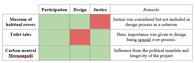 In the Museum of Habitual Errors, there was community participation as well as informed design approaches within city governance. The architects and designers team deliberately took clues from the site and overall concept of public awareness in the issues of waste, while curating/designing the museum. As I reflect, I can see layers of inherent justice flowing into it, like the decision on choosing materials and creating an experience that opens the public eye towards environmental justice. However, conceptual during the design process it was not included as a parameter with discrete outcomes.
