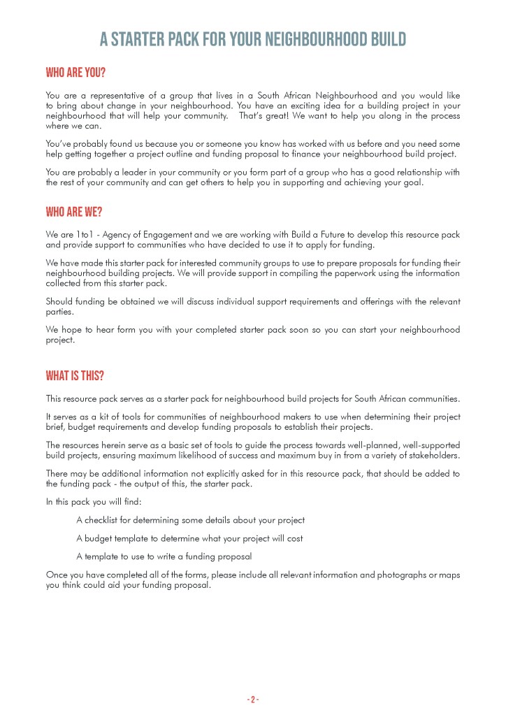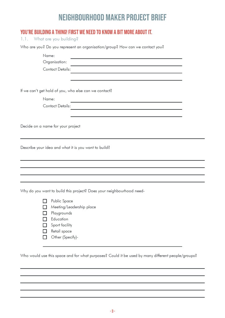 The Neighborhood Builder Starter Pack is a field tool that allows for a quick and clear project identification and development path for neighborhood leaders or residents to start a tactical build project.