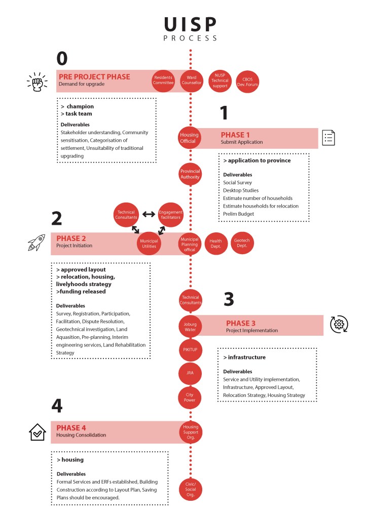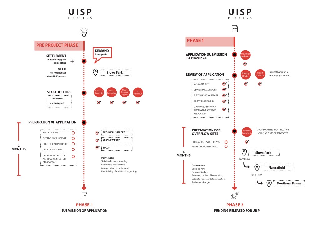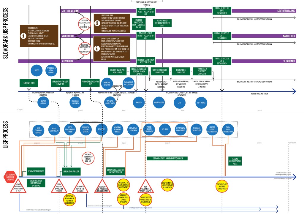 The UISP RoadMap Tool is a specific combination tool, training package that supports all actors involved with in-situ informal settlement upgrading processes in South Africa. The tool works in conjunction with the Timeline Action Planning Tool and is being developed at the moment in support of Slovo Park’s ongoing engagement with the City of Johannesburg.